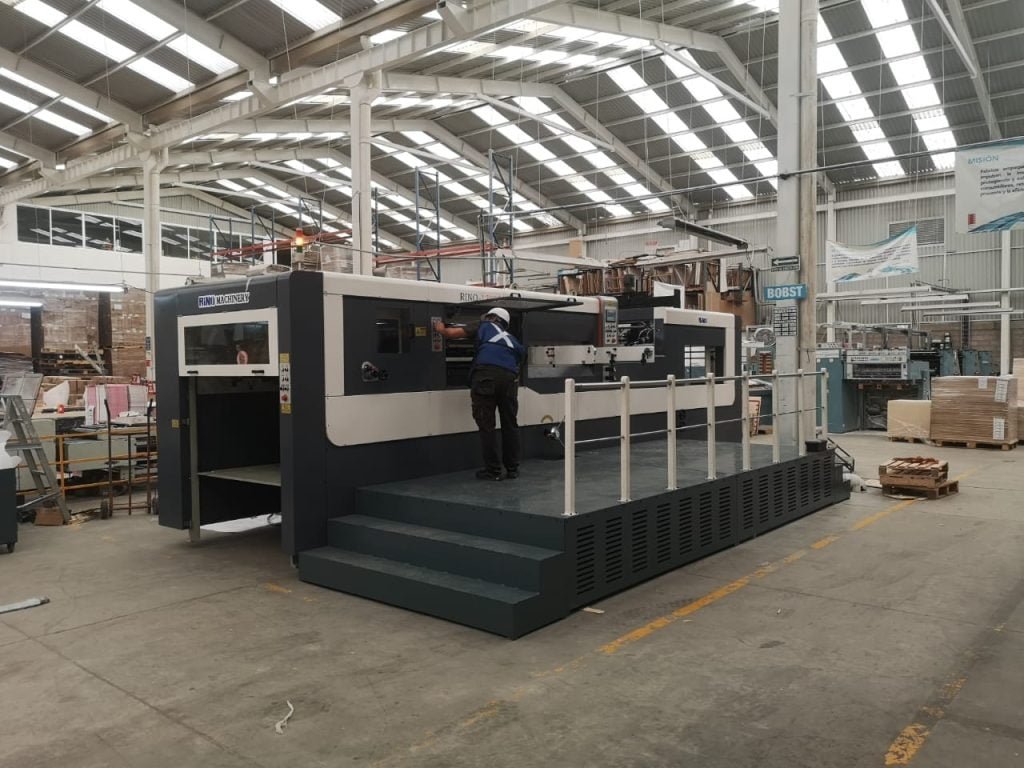 con 2 unidades de impresión, alimentación de cadena con suaje rotatorio y modificaciones de seguridad.